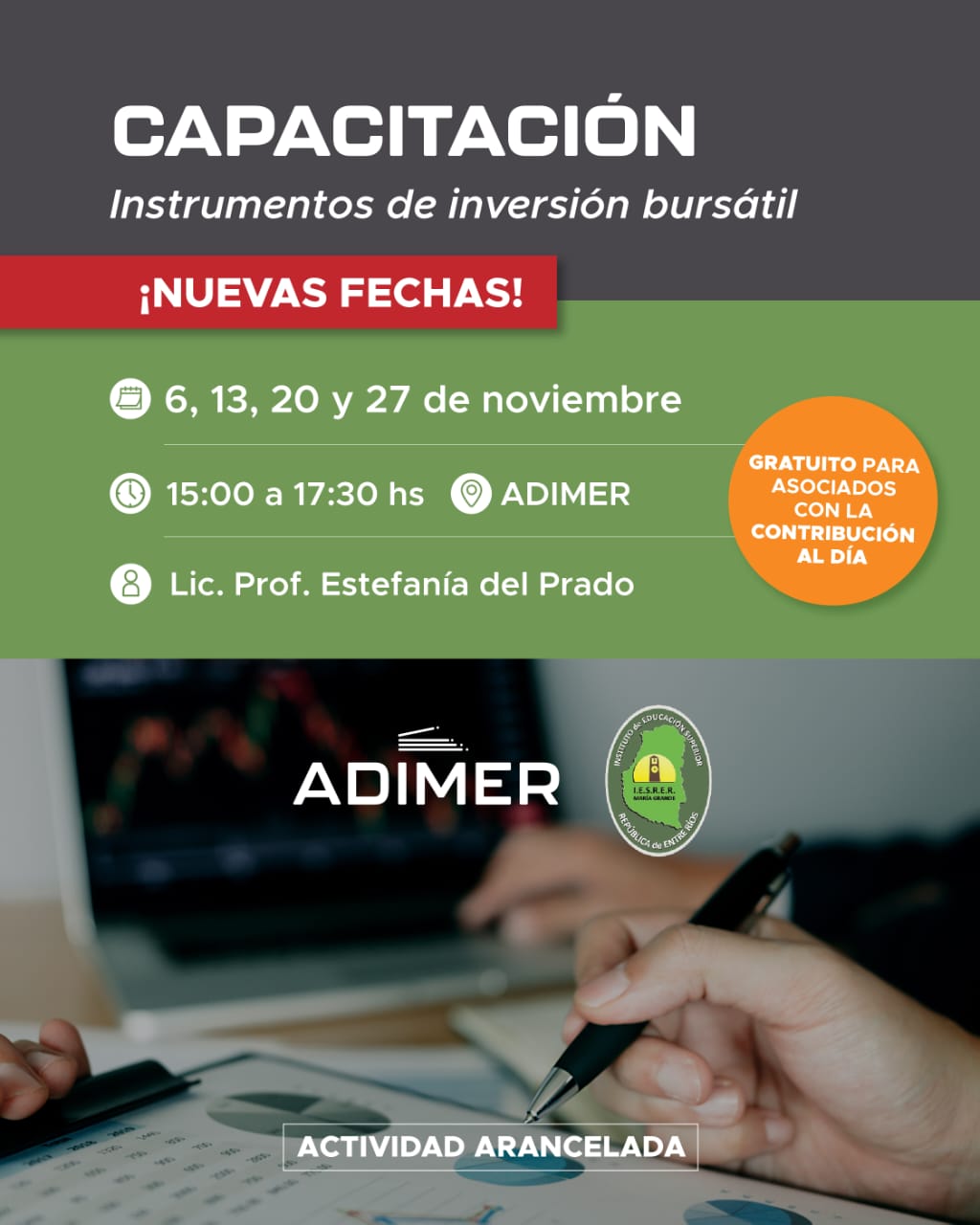 El Instituto de Educación Superior “República de Entre Ríos” (IES RER), en articulación con la Asociación de Industriales Metalúrgicos de Entre Ríos (ADIMER), invita a participar de la capacitación “Instrumentos de inversión bursátil”, a cargo de la Lic. Estefanía Del Prado, docente de la Tecnicatura Superior en Administración de Empresas del IES RER. La capacitación está dirigida a … [+]
